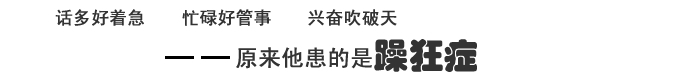 张某:男,48岁,农民,近一个多月来无明显诱因出现失眠,早醒,话多,好发脾气,且日渐加重。近两周来出现乱花钱,到市场上管闲事,说买卖,吹大话,因此与别人发生冲突,谁劝也不听,个人感觉本事大极了,情绪不稳定,一会儿因一点小事与人发脾气,一会儿又说与这人关系如何好,整天站不住脚,还说要做大生意,开大公司,高兴的不得了,有时还会当众高歌一曲,本来平时性格内向,现在与人见面熟,好开玩笑,好与异性接触,整日忙碌不停,不知疲倦,做事多有头无尾。虽食欲增加,但日渐消瘦,在家人陪同下就诊。